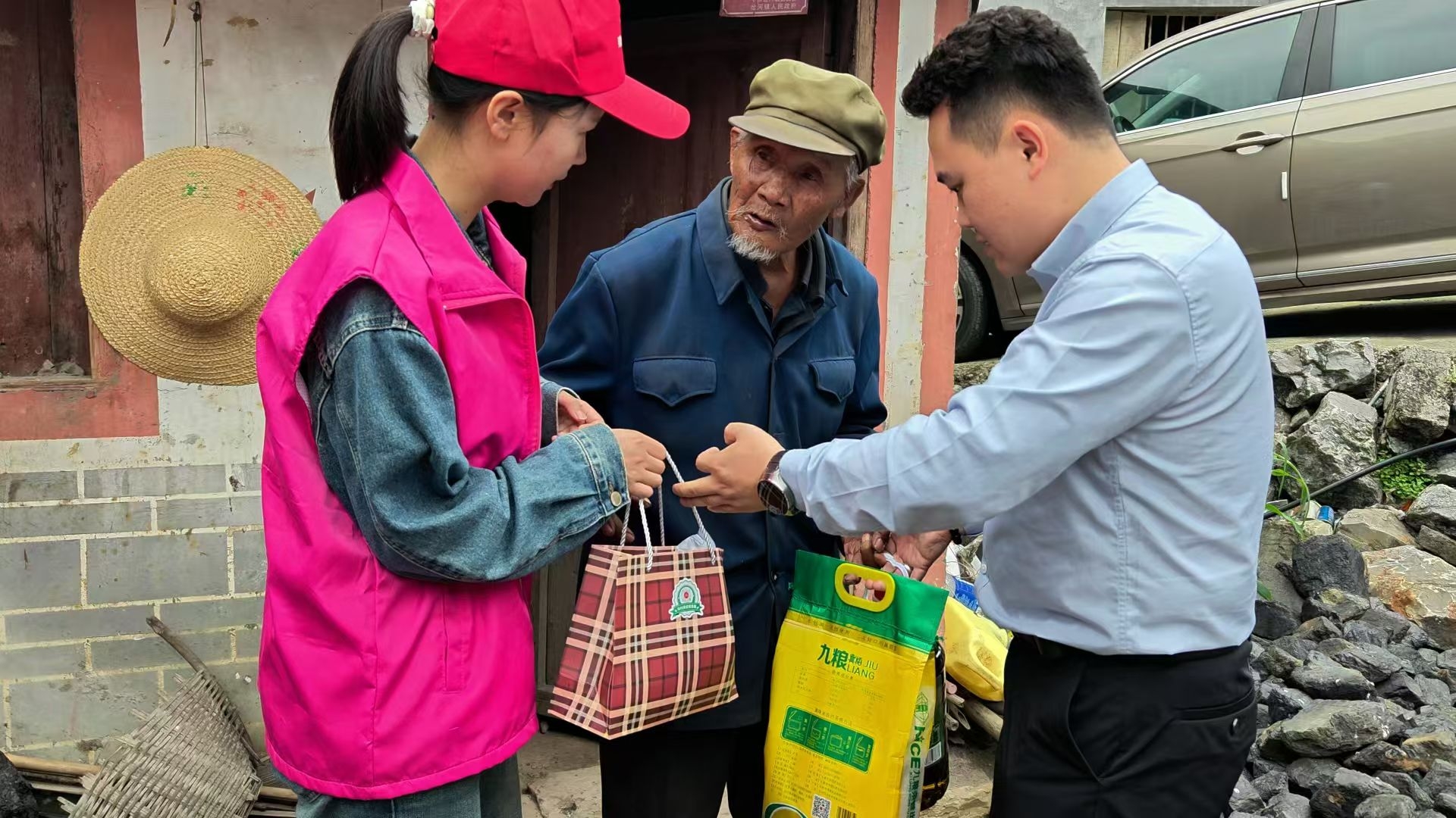 在当地乡镇政府工作人员的带领下,秦佳琪全体员工分批带队到慰问对象家中,将公司准备的大米、大豆油、粽子,亲手交到特困老人手中。