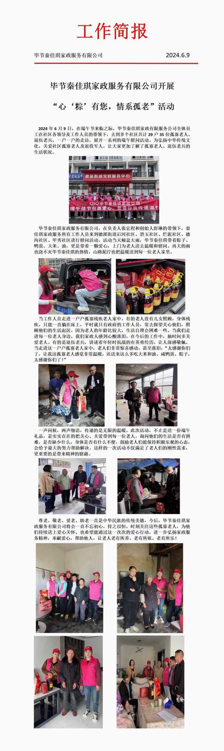 2024年6月9日,在端午节来临之际,秦佳琪毕节公司全体员工在社区各领导及工作人员的带领下,去到多个社区共计29户35位孤老人、