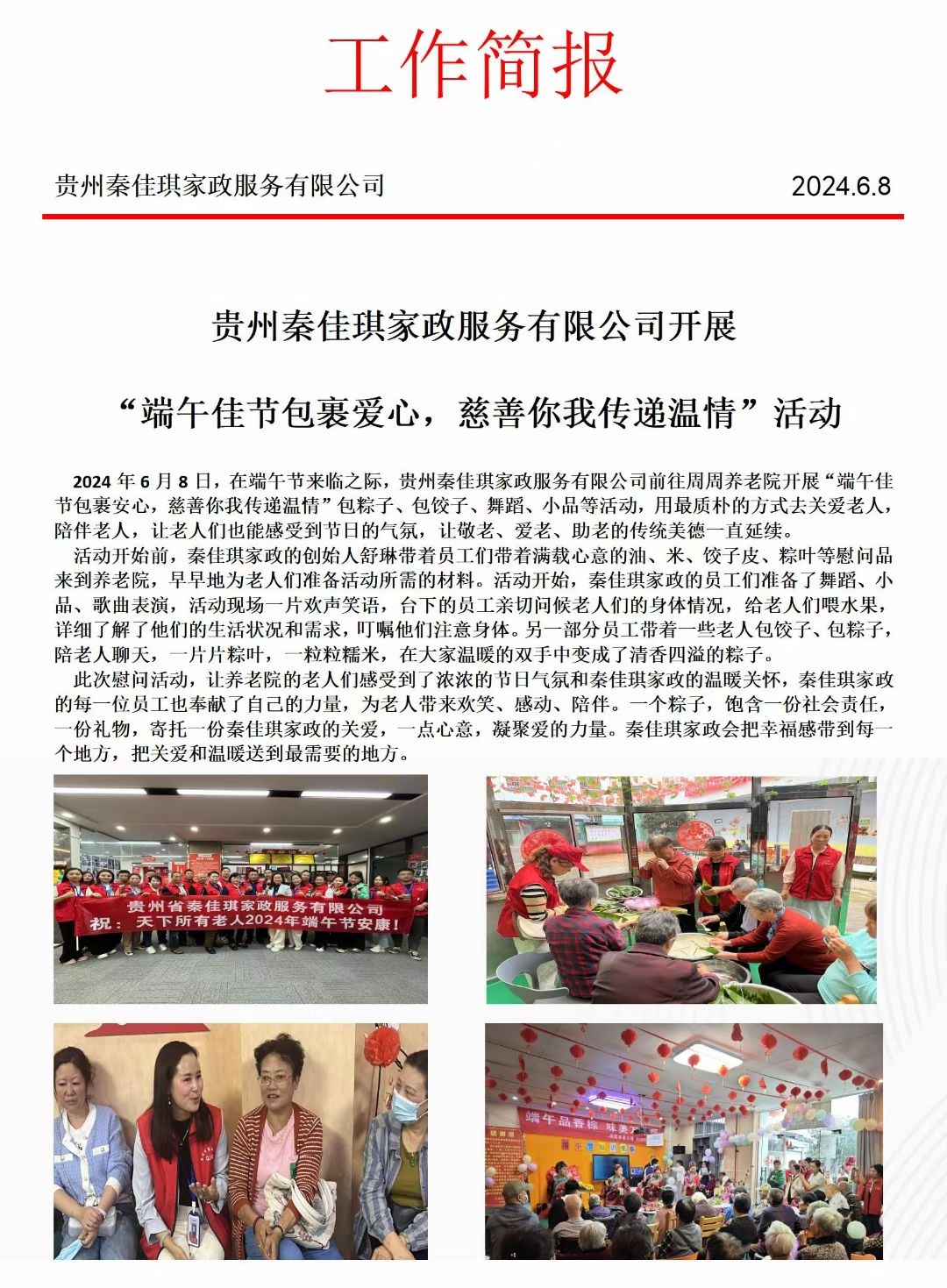 2024年6月8日,秦佳琪贵阳公司前往贵阳周周养老院进行“端午佳节包裹安心,慈善你我传递温情”活动,包粽子、包饺子、舞蹈、小品等活动,用最质朴的方式去关爱老人,陪伴老人,让老人们也能感受到节日的气氛,让敬老、爱老、助老的传统美德一直延续。活动开始前,秦佳琪家政的创始人舒琳带着员工们带着满载心意的油、米、饺子皮、粽叶等慰问品来到养老院,早早地为老人们准备活动所需的材料。活动开始,秦佳琪家政的员工们准备了舞蹈、小品、歌曲表演,活动现场一片欢声笑语,台下的员工亲切问候老人们的身体情况,给老人们喂水果,详细了解了他们的生活状况和需求,叮嘱他们注意身体。另一部分员工带着一些老人包饺子、包粽子陪老人聊天,一片片粽叶,一粒粒糯米,在大家温暖的双手中变成了清香四溢的粽子。此次慰问活动,让养老院的老人们感受到了浓浓的节日气氛和秦佳琪家政的温暖关怀,秦佳琪家政的每一位员工也奉献了自己的力量,为老人带来欢笑、感动、陪伴。一个粽子,饱含一份社会责任,一份礼物,寄托一份秦佳琪家政的关爱,一点心意,凝聚爱的力量。秦佳琪家政会把幸福感带到每一个地方,把关爱和温暖送到最需要的地方。